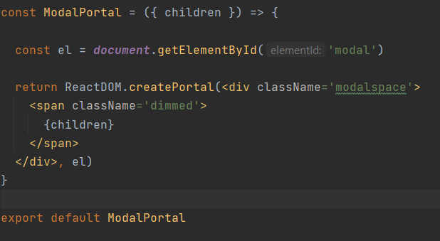 const ModalPortal = ({ children }) => { const el = document.getElementById('modal') return ReactDOM.createPortal({children}, el) } export default ModalPortalModalPortal 은 기본적으로 위 와 같은 형태를 가지고 있는데, 코드를 만지작 거리던 중 당연하게도(?) 해당 포탈은 커스터마이징이 가능한걸 알게되었다.
